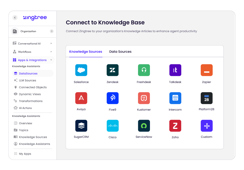 Low-lift integrations with your existing knowledge, tools, and data sources. Automate interactions across your backend systems.